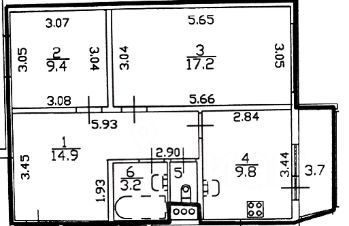 Общая площадь квартиры: 55,6 кв.м, жилая 26,6 кв.м, площадь комнат: 17,2 кв.м.+9,4 кв.м., кухня: 10 кв. м., прихожая: 15 кв.м., раздельный санузел, застекленный балкон, высота потолков: 2.7 м., балкон: 3,7 м.