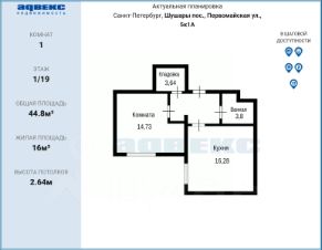 Продаётся, однокомнатная квартира общей площадью 44,8 м2, в г.Санкт-Петербург, Шушары, ул. Первомайская дом 5, корпус 1. Кирпичный дом, серия дома Индивидуальный проект от компании "Норман".