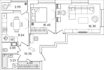 Квартира находится в 22 этажном доме, в Корпус 5 на 9 этаже. Общая площадь квартиры 59,70 кв.м.