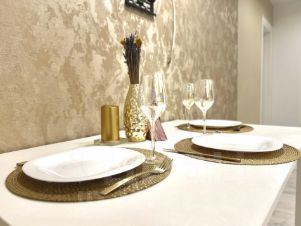 Установлен выполненный на заказ кухонный гарнитур с встроенной техникой BOSCH: посудомоечная машина, варочная панель, микроволновая печь, духовой шкаф, холодильник Samsung, вытяжка HANSA, обеденный стол, встроенный шкаф, стеллаж, кровать с ортопедическим матрасом, прикроватные тумбы, шкаф в прихожей.