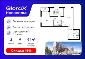 Продается 2-комн. квартира на 9-м этаже в строящемся проекте комфорт-класса GloraX Новоселье. Общая площадь лота составляет 61,08 кв. м, из которых 25,33 кв. м отведено под жилую и 17,12 кв. м под кухонную зону. Номер квартиры - 125