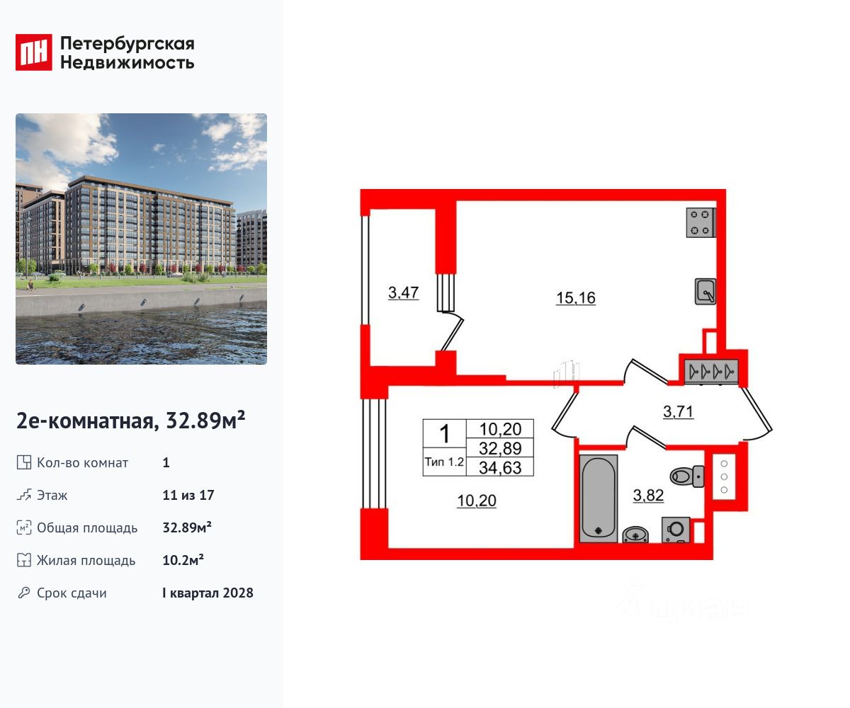 Удобная, классическая, функциональная европланировка, большая кухня-гостиная 15.16 м², вместительная прихожая 3.71 м². Общая площадь квартиры - 32.89 м², жилая 10.2 м², высота потолка 2.77 м.