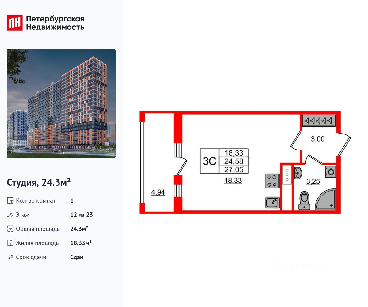 Удобная, классическая, функциональная европланировка, вместительная прихожая 3 м². Общая площадь студии - 24.3 м², жилая 18.33 м², высота потолка 2.77 м.