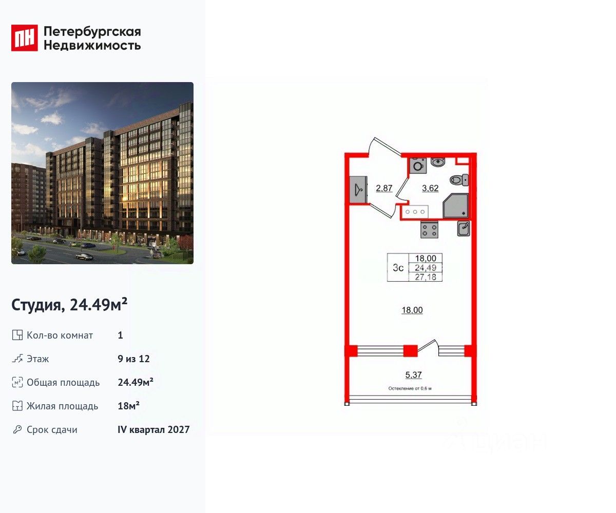 Удобная, классическая, функциональная европланировка, вместительная прихожая 2.87 м². Общая площадь студии - 24.49 м², жилая 18 м², высота потолка 2.75 м.