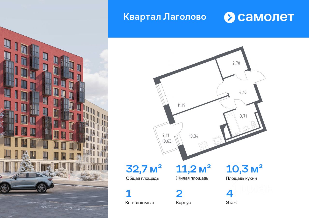 Строим кварталы для жизни с заботой о будущем. Предлагается 1-комнатная квартира комфорт-класса 32,73 кв.м в корпусе 2 на 4 этаже, в ЖК "Квартал Лаголово"