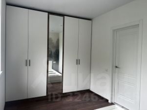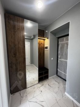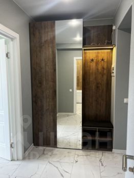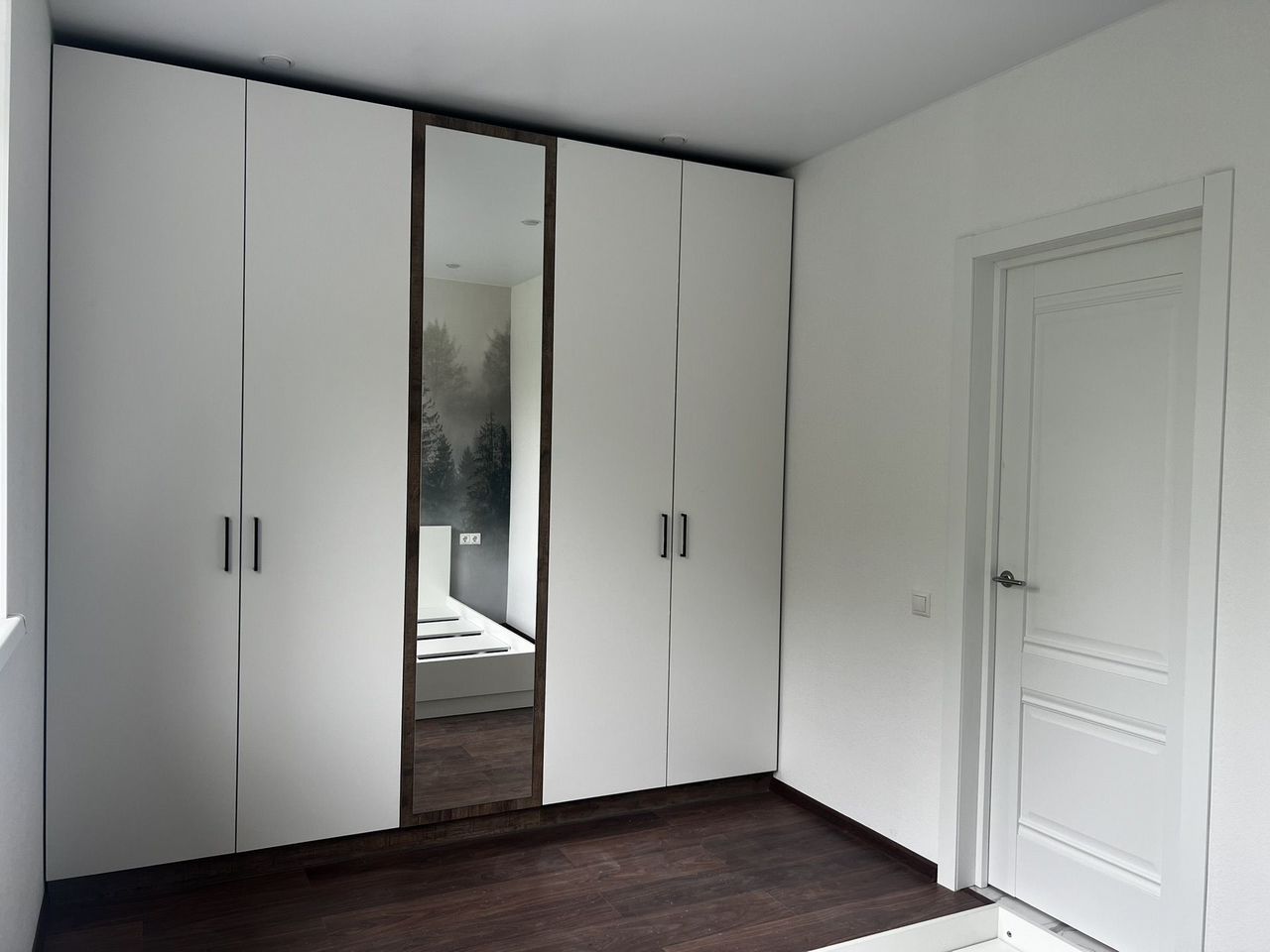В квартире кровать, большой шкаф для хранения вещей, стильная кухня с техникой, обеденная зона, современная прихожая и просторный сан/узел.