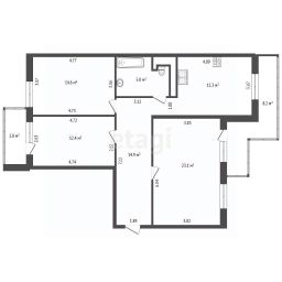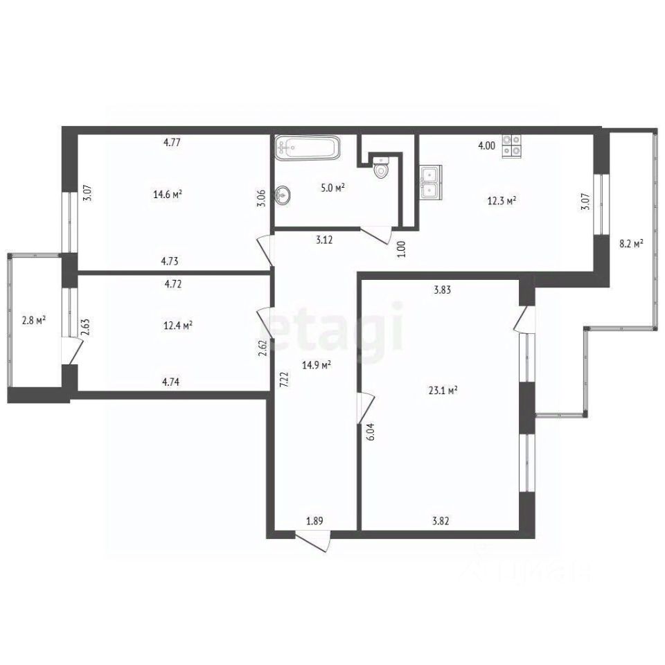 Общая жилая площадь 50,1 (три раздельные комнаты 12,4+14,6+23,1) кв.м. Просторный, объемный коридор 14,9 кв.м.