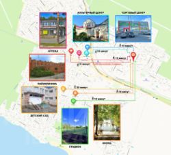 • В пешей доступности детсад, школа, аптека, торговый центр, культурный центр, стадион, схема прилагается.
