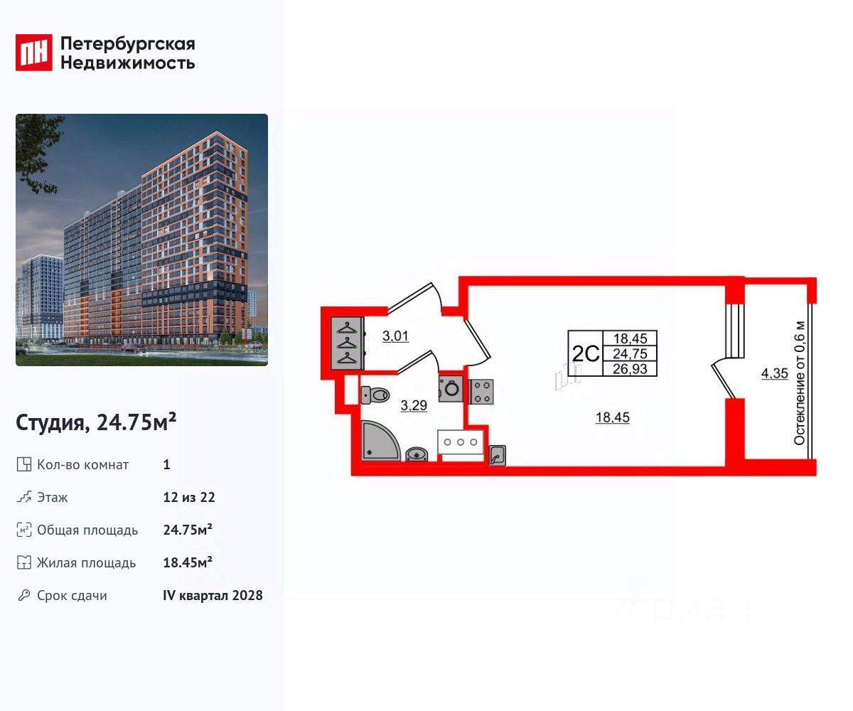Удобная, классическая, функциональная европланировка, вместительная прихожая 3.01 м². Общая площадь студии - 24.75 м², жилая 18.45 м², высота потолка 2.77 м.