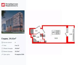 Удобная, классическая, функциональная европланировка, вместительная прихожая 3.02 м². Общая площадь студии - 24.61 м², жилая 18.33 м², высота потолка 2.77 м.