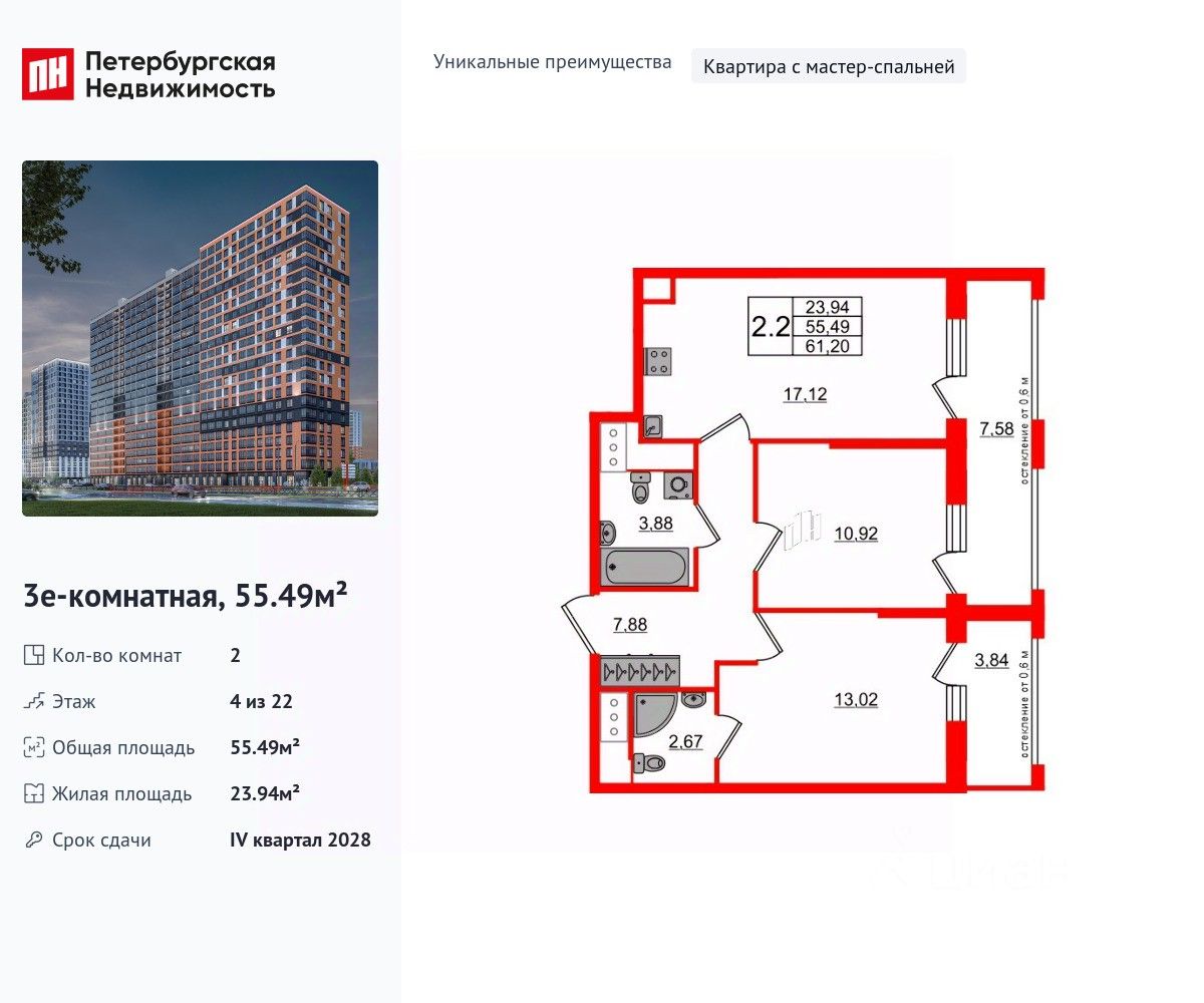 Уникальная, функциональная европланировка, большая кухня-гостиная 17.12 м², вместительная прихожая 7.88 м². Общая площадь квартиры - 55.49 м², жилая 23.94 м², высота потолка 2.77 м.