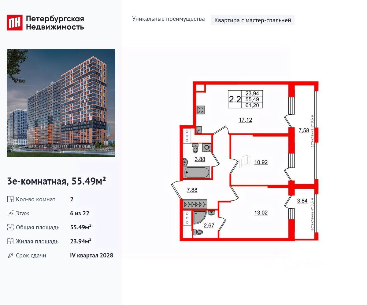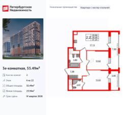 Уникальная, функциональная европланировка, большая кухня-гостиная 17.12 м², вместительная прихожая 7.88 м². Общая площадь квартиры - 55.49 м², жилая 23.94 м², высота потолка 2.77 м.