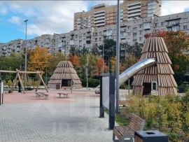 Уютный двор с детской площадкой, рядом парк для прогулок.