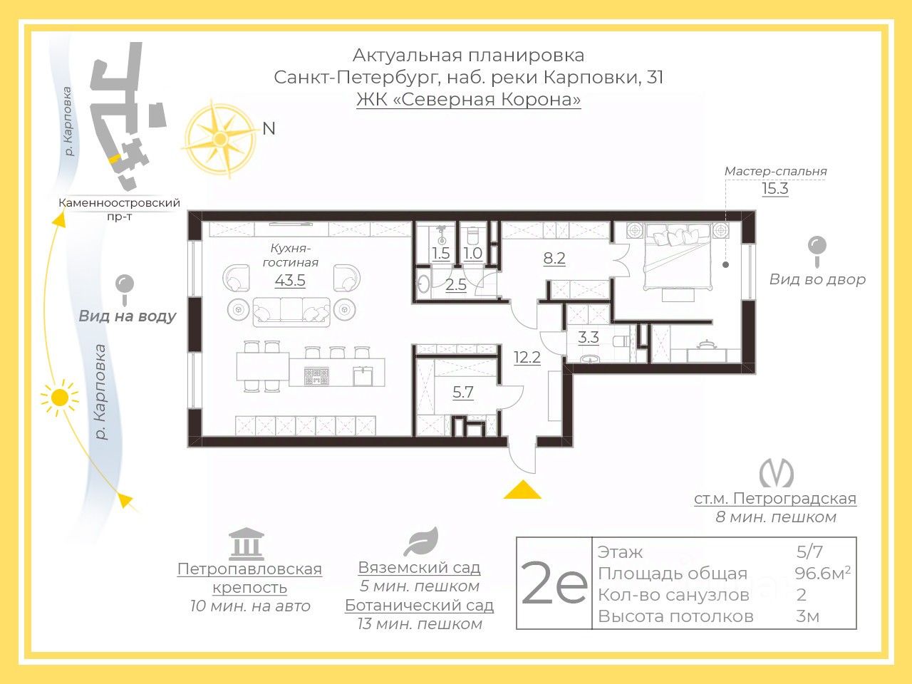 Предлагается к продаже просторная квартира площадью 96,6 м² в современном премиальном комплексе "Северная корона" на Петроградской стороне, в точке пересечения Каменноостровского проспекта и набережной реки Карповки.
