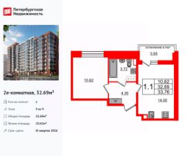 Удобная, классическая, функциональная европланировка, большая кухня-гостиная 14 м², просторная прихожая 4.35 м². Общая площадь квартиры - 32.69 м², жилая 10.62 м², высота потолка 3 м.