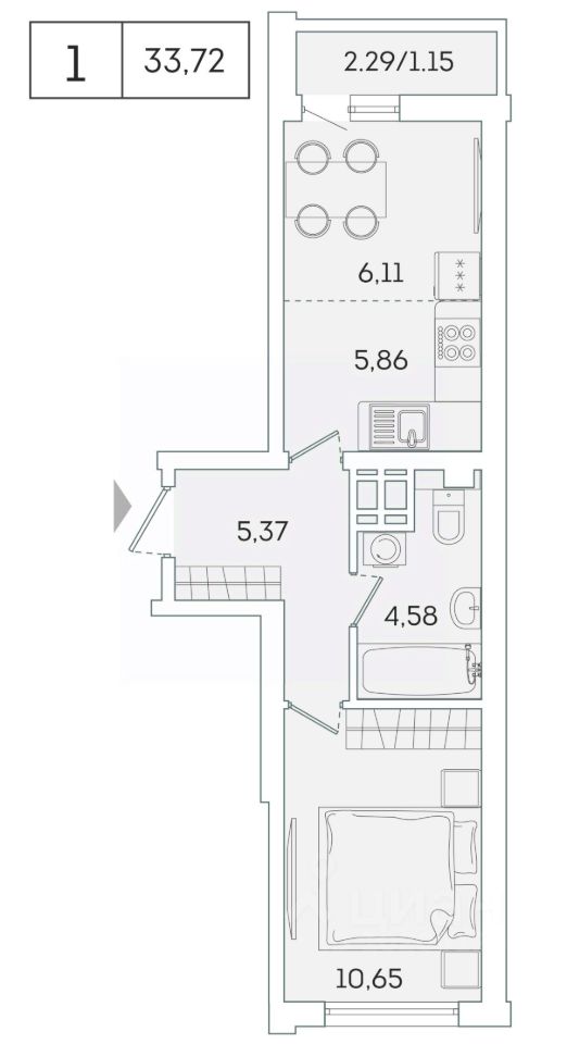 В продаже от застройщика 1 комнатная квартира 32.7 кв. м с черновой отделкой и практичной планировкой для удобной организации пространства. Корпус сдан, идет выдача ключей.