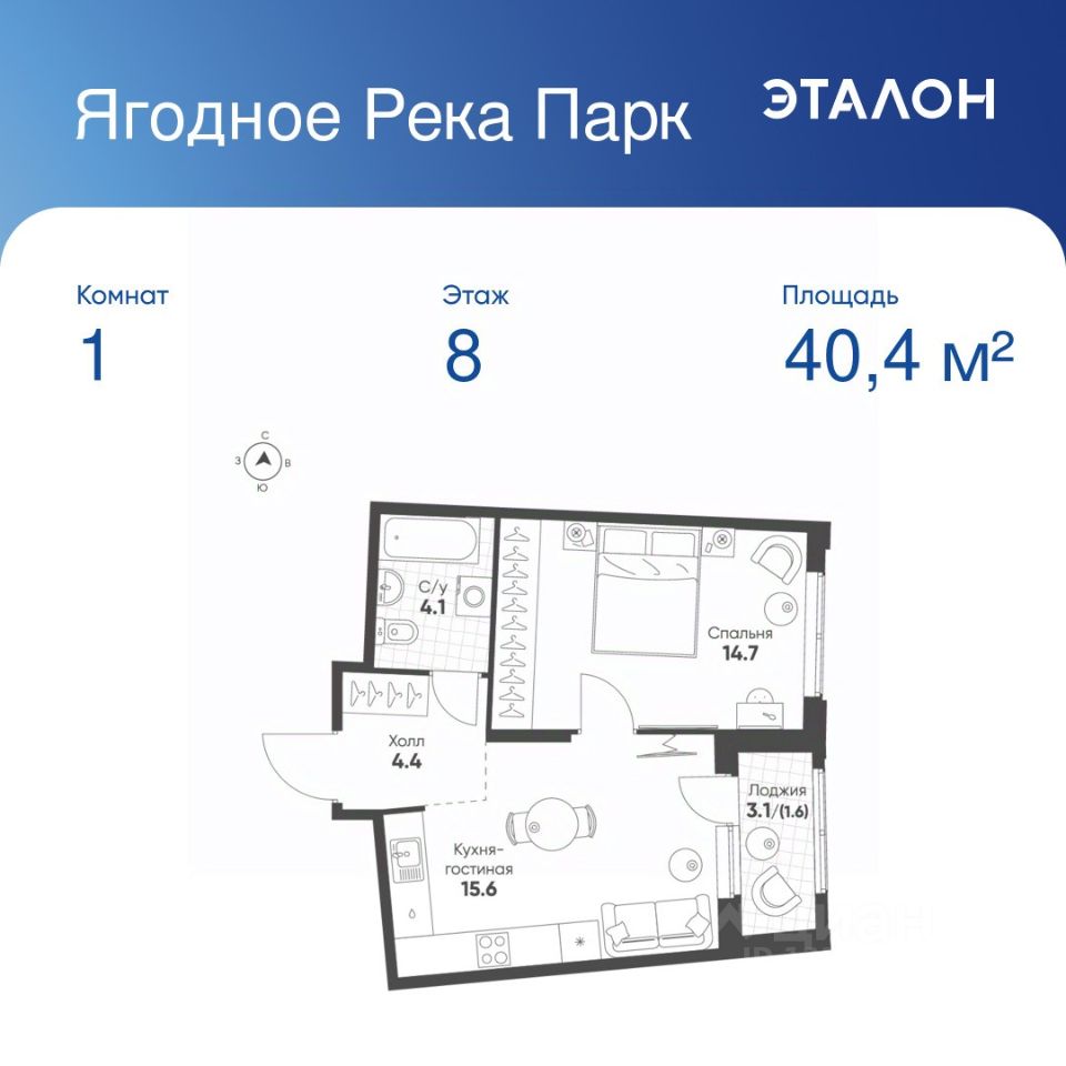 Продается 1-к квартира без отделки в ЖК "Ягодное Река Парк".