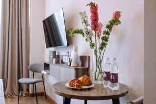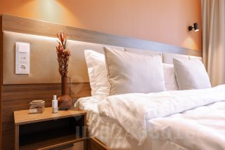 Номера выполнены в стильном дизайне, наполнены мебелью.