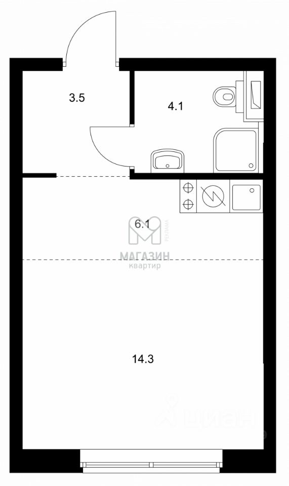 Общая площадь 28 м². Высота потолков 2.82 м. Свободная продажа. Чистая сделка.