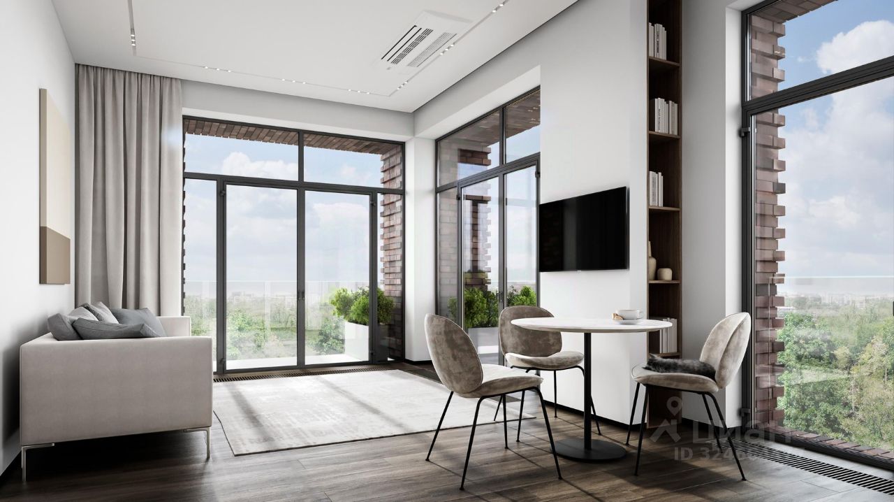 В отделку квартиры входит стяжка пола, разводка электрики, радиаторы отопления, окна с фурнитурой, конвекторы в полу, ввод горячей и холодной воды и выводы под канализацию.