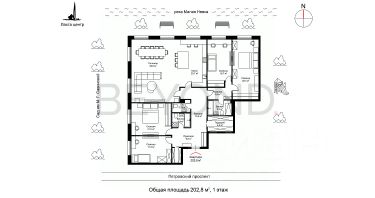 Общая площадь квартиры — 202,8 кв. м, высота потолков — 3 метра, а широкие дубовые окна наполняют помещение светом и ощущением простора. Расположенная в привилегированном корпусе 3 на первом этаже, квартира впечатляет масштабом и возможностями. Изначальная планировка предусматривает пять отдельных комнат, при этом самая большая — 49,6 кв. м — прилегает к кухне и легко трансформируется в просторную гостиную, идеально подходящую для семейного отдыха и объединённого пространства.