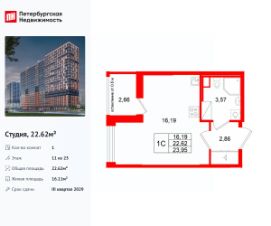 Удобная, классическая, функциональная европланировка, вместительная прихожая 2.82 м². Общая площадь студии - 22.62 м², жилая 16.11 м², высота потолка 2.77 м.