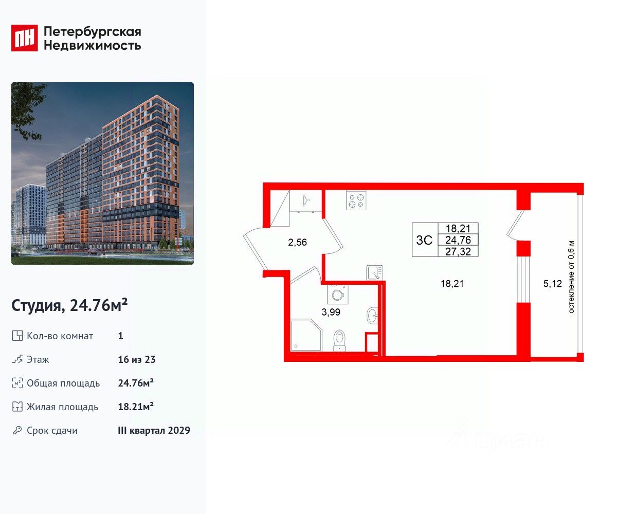 Удобная, классическая, функциональная европланировка, вместительная прихожая 2.56 м². Общая площадь студии - 24.76 м², жилая 18.21 м², высота потолка 2.77 м.