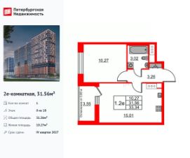 Удобная, классическая, функциональная европланировка, большая кухня-гостиная 15.01 м², вместительная прихожая 3.26 м². Общая площадь квартиры - 31.56 м², жилая 10.27 м², высота потолка 2.77 м.