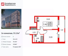 Удобная, классическая, функциональная европланировка, большая кухня-гостиная 15.05 м², вместительная прихожая 4.18 м². Общая площадь квартиры - 33.15 м², жилая 10.06 м², высота потолка 3 м.