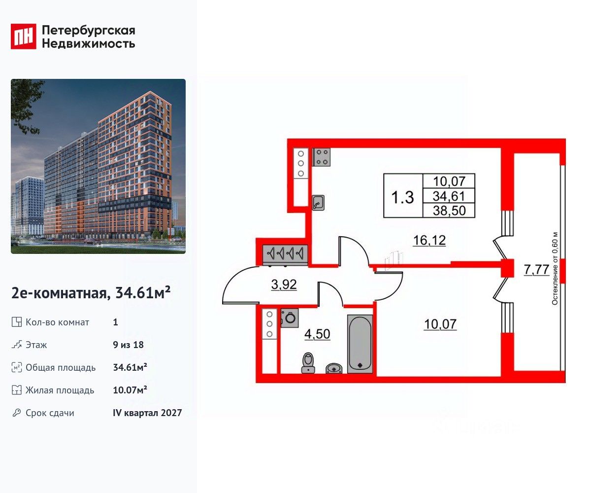 Удобная, классическая, функциональная европланировка, большая кухня-гостиная 16.12 м², вместительная прихожая 3.92 м². Общая площадь квартиры - 34.61 м², жилая 10.07 м², высота потолка 2.77 м.