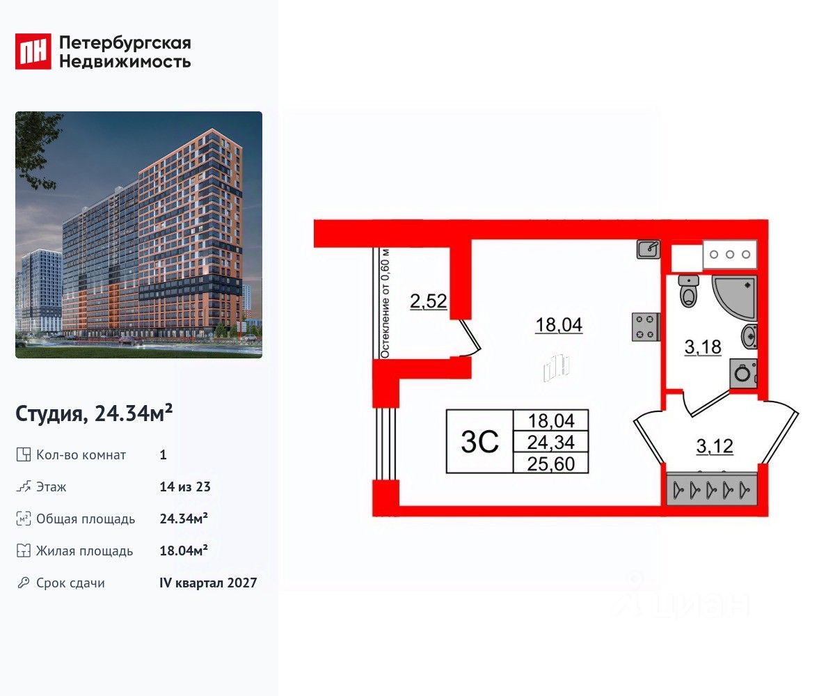 Удобная, классическая, функциональная европланировка, вместительная прихожая 3.12 м². Общая площадь студии - 24.34 м², жилая 18.04 м², высота потолка 2.77 м.