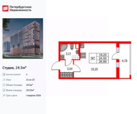Удобная, классическая, функциональная европланировка, вместительная прихожая 3.04 м². Общая площадь студии - 24.5 м², жилая 18.25 м², высота потолка 2.77 м.