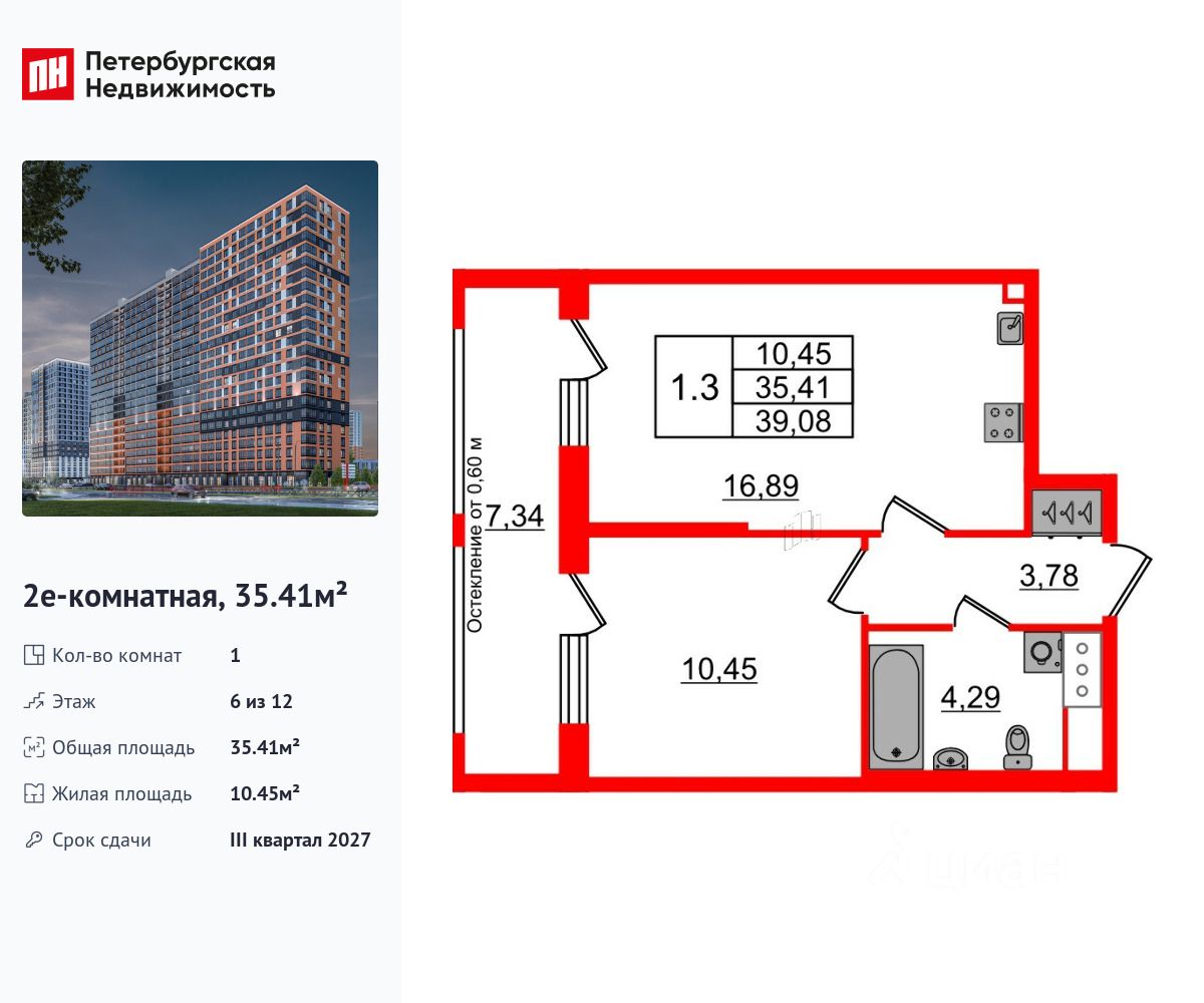Удобная, классическая, функциональная европланировка, большая кухня-гостиная 16.89 м², вместительная прихожая 3.78 м². Общая площадь квартиры - 35.41 м², жилая 10.45 м², высота потолка 2.77 м.
