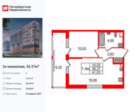 Удобная, классическая, функциональная европланировка, большая кухня-гостиная 18.06 м², вместительная прихожая 3.63 м². Общая площадь квартиры - 36.37 м², жилая 10.02 м², высота потолка 2.77 м.