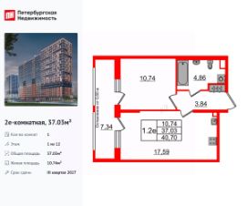 Удобная, классическая, функциональная европланировка, большая кухня-гостиная 17.59 м², вместительная прихожая 3.84 м². Общая площадь квартиры - 37.03 м², жилая 10.74 м², высота потолка 2.77 м.