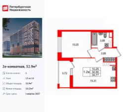 Удобная, классическая, функциональная европланировка, большая кухня-гостиная 15.31 м², вместительная прихожая 3.68 м². Общая площадь квартиры - 32.9 м², жилая 10.25 м², высота потолка 2.75 м.