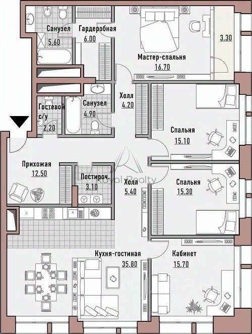 Три изолированные спальни , одна из которых мастер -со своим санузлом и гардеробной