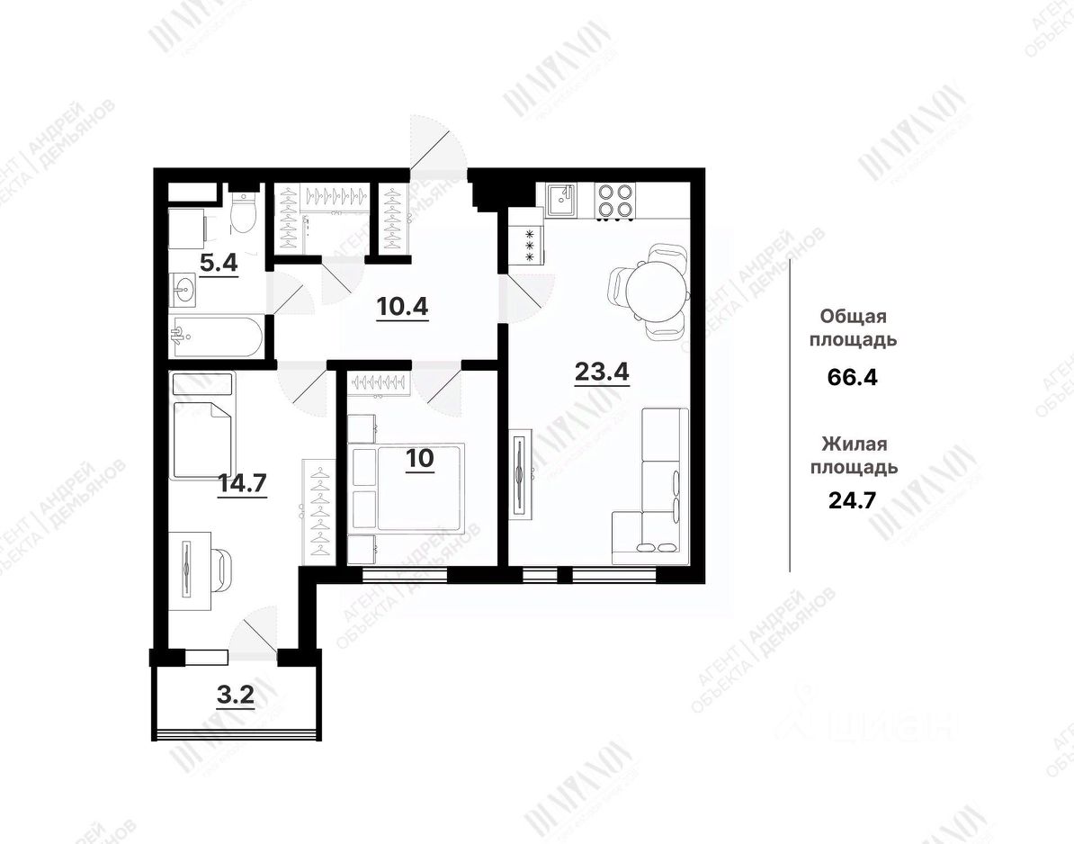 Квартира 66,4 м чистого комфорта в нoвом дoмe БИЗНЕC-КЛACCA YES Residence