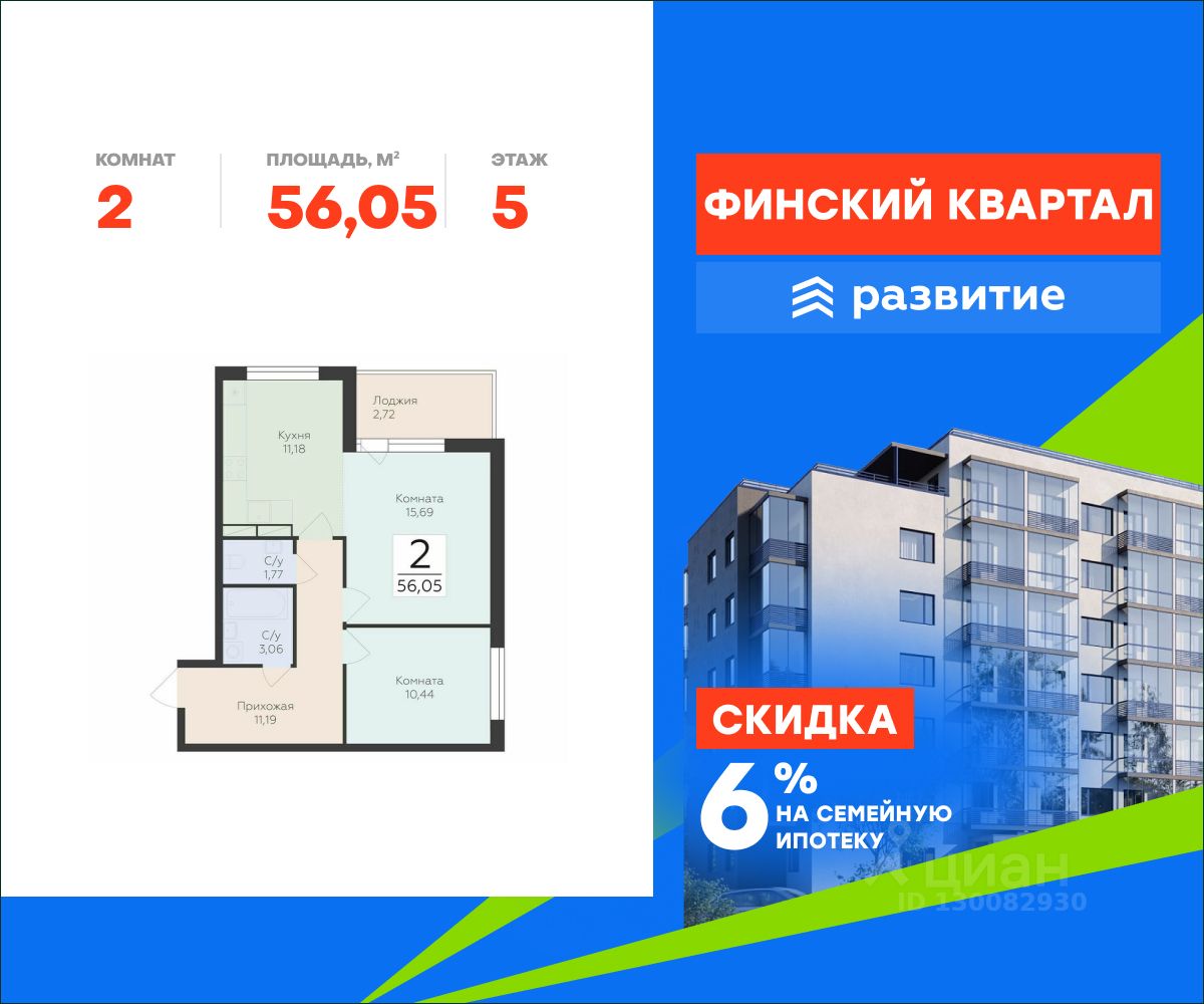 Продается квартира площадью 56.05 кв. м с отделкой white box. Квартира расположена на 5 этаже 8 этажного дома, в жилом комплексе комфорт-класса "Финский Квартал".