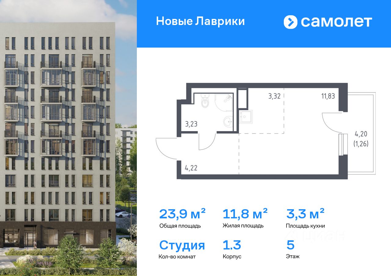 Строим кварталы для жизни с заботой о будущем. Предлагается квартира студия комфорт-класса 23,86 кв.м в корпусе 1.3 на 5 этаже, в ЖК "Новые Лаврики"