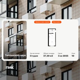 Продаётся квартира-студия площадью 27,2 кв.м на 10 этаже 12 этажного дома (Корпус 3.1, Секция 2) проекта ПИК Таллинский парк. Светлый просторный подъезд на уровне земли, функциональная планировка, большие окна, предчистовая отделка.