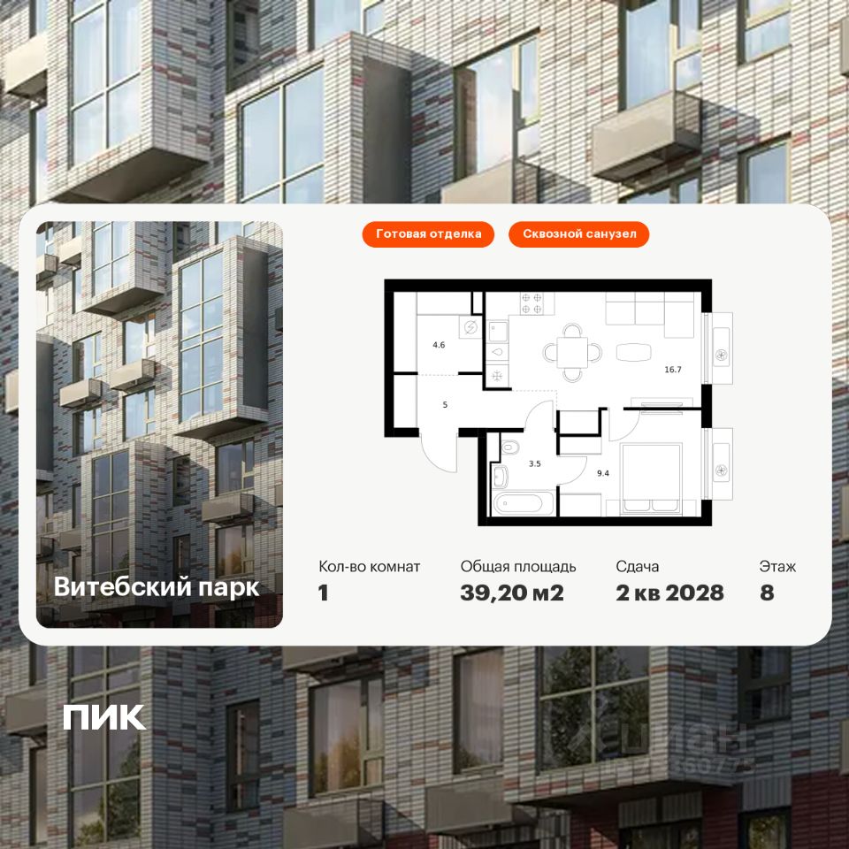 Продаётся 1-комн. квартира площадью 39,2 кв.м на 8 этаже 12 этажного дома (Корпус 7, Секция 4) проекта ПИК Витебский парк. Светлый просторный подъезд на уровне земли, функциональная планировка, большие окна, c отделкой.