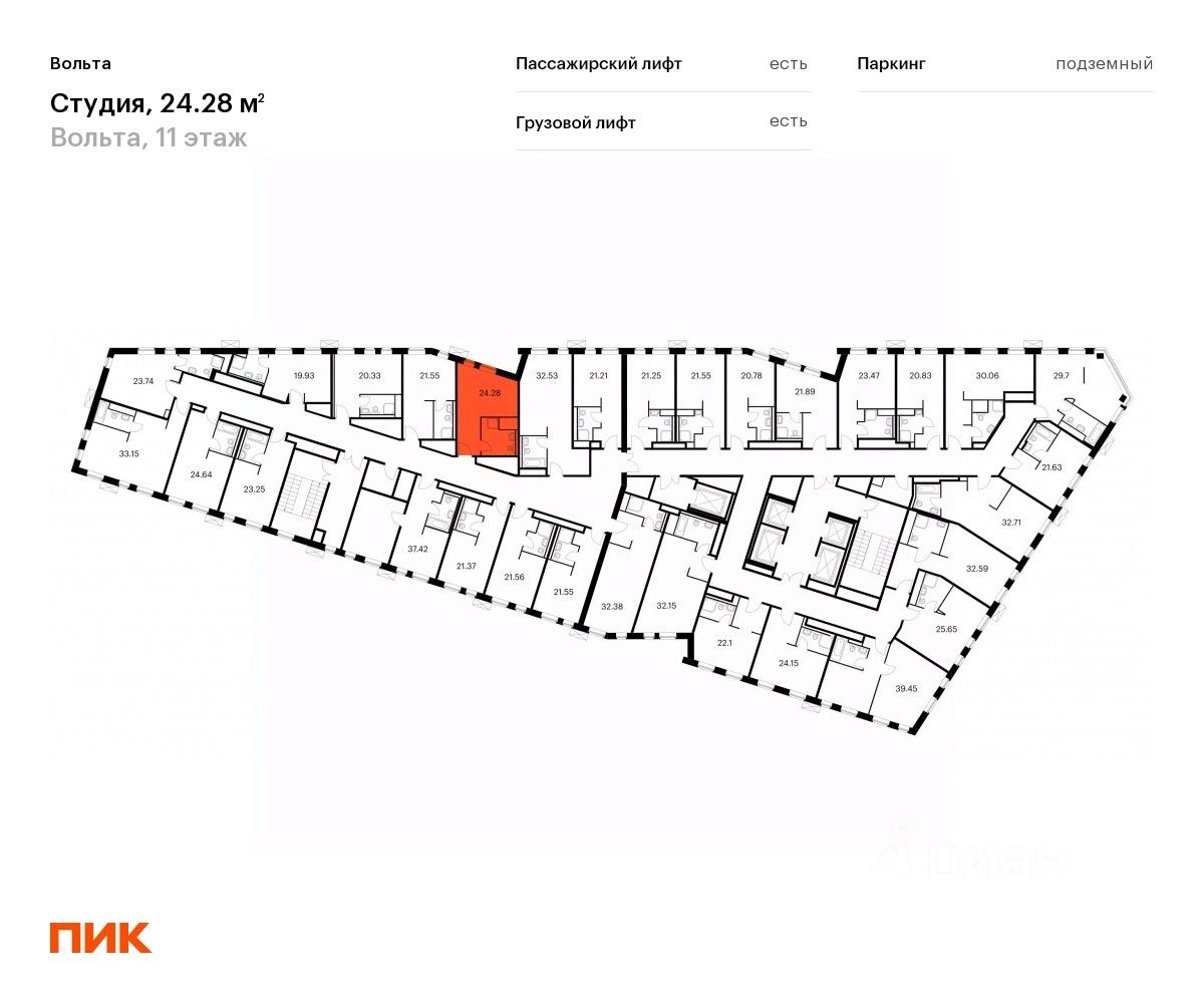 Продаются апартаменты-студия площадью 24,28 кв.м на 11 этаже 15 этажного дома (Вольта, Секция 1) проекта ПИК Вольта.