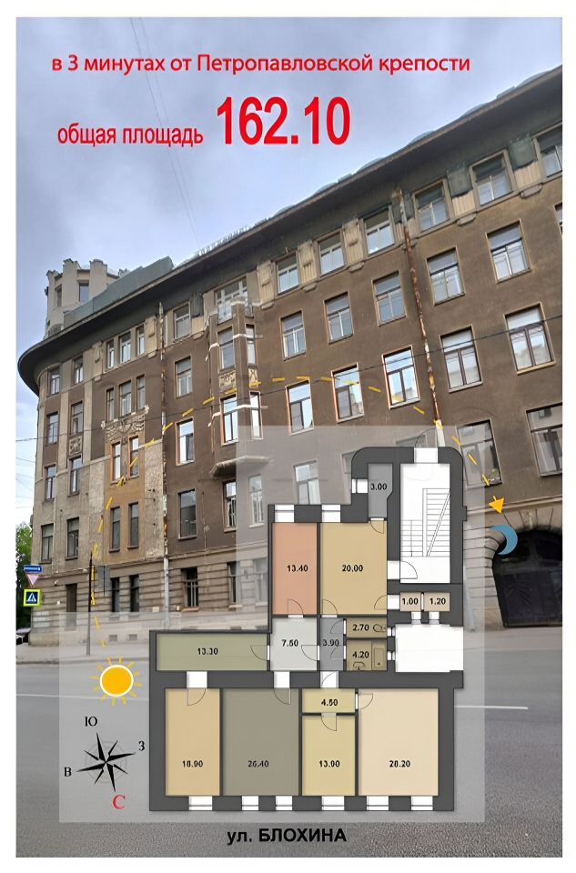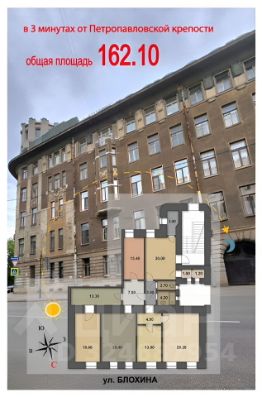 В самом сердце исторического центра Санкт-Петербурга, всего в 3 минутах пешком от Петропавловской крепости, в шаговой близости от Ростральных колонн, Дворцового и Биржевого мостов, в доходном доме Кёнига, ищет нового хозяина просторная 5-комнатная квартира. В этой квартире — дыхание времени. Потолки почти 4 метра, паркет ёлочкой, лепнина, мебель в стиле модерн Всё здесь напоминает о Петербурге эпохи серебряного века. А за окном — купола Петропавловского собора, Нева, арки старинных дворов и свет северного города. Это не просто квартира — это историческая сцена, где вы можете стать её главным героем. Основные Характеристики: Общая площадь — 162,1 м². Жилая площадь — 100 м². Высота потолков — 3,8 м. Кухня — 20 м². Комнат — 5, планировка позволяет разделить на студии или сделать 23 полноценные квартиры. Всего одна несущая стена, все комнаты раздельные. В ванной и туалете окна, есть кладовые, и есть даже комната-холодильник. Вход — с улицы Блохина через арку со двора. Историческая Ценность И Архитектура: Дом с богатейшей историей. Здание в стиле модерн было построено в 1911-1912 гг. По проекту арх. К. К. Шмидта. Классический доходный дом начала XX века, с выразительным фасадом, аркой и историческими деталями. Сохранилась оригинальная лепнина на потолках, старинный паркет ёлочка, элементы мебели в стиле модерн. Уютный внутренний двор с парковкой. Квартира не числится в реестре объектов культурного наследия, который ведет Комитет по государственному контролю, использованию и охране памятников истории и культуры (Кгиоп). Состояние: Квартира под ремонт, что позволяет воплотить собственный дизайн. Сохранились аутентичные элементы — двери, лепнина, печь на кухне с заслонками, шпингалеты на окнах. Раздельный санузел. Просторная кухня. Коммуникации И Документы: Перекрытия — металлические балки. Газ, вода, электричество подключены. 2 собственника, документы готовы к сделке. Без обременений, прямая продажа. Локация И Инфраструктура: 3 минуты до Петропавловской крепости, Невы, Дворцовой набережной. Рядом метро Спортивная и Горьковская. В пешей доступности — Такие значимые культурные объекты как Эрмитаж, Кунсткамера, Дворцовая набережная, крейсер Аврора, Князь- Владимирский собор и Князь-Владимирский сквер, Александровский парк, Ленинградский зоопарк и конечно легендарная котельная Камчатка, знаменитая Военно-космическая академия имени А. Ф. Можайского и Санкт-Петербургский государственный университет. Топовая локация Петроградского района — для жизни, аренды и инвестиций! Идеально Под: Семейное проживание в самом центре Петербурга. Тихий комфортный офис в самом центре. Проект по сдаче в аренду /разделение на студии. Инвестиции в уникальную локацию с растущей ценностью. Эта квартира — настоящая находка в историческом Петербурге. Звоните И Приходите На Просмотр!