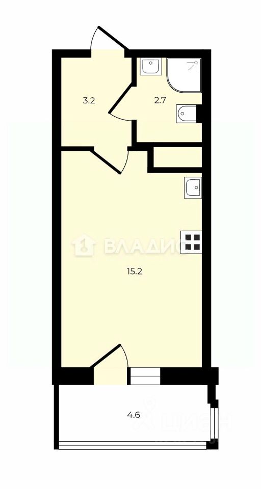 Площадь и планировка: общая площадь студии составляет 23 кв. м, из которых жилая площадь — 15,2 кв. м, а площадь кухни — 5 кв. м. Просторность и функциональность планировки позволяют эффективно использовать каждый метр пространства.