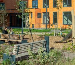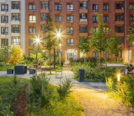 Внутренние пространства выполнены из экологичных материалов, высажены крупные деревья, использован разноландшафтный дизайн, а во дворе расположен большой природный объект — массивное дерево, ставшее местом притяжения жителей.