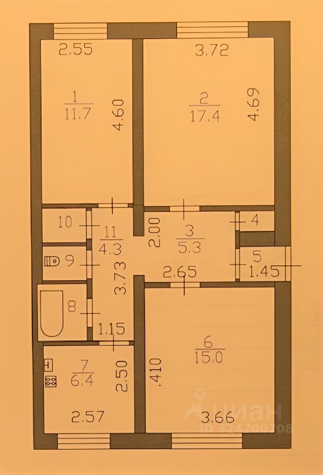 Изолированные комнаты - 17,4 кв.м, 15 кв.м, 11,7 кв.м.