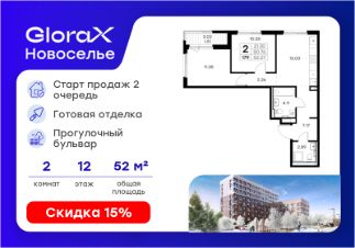 Продается 2-комн. квартира на 12-м этаже в строящемся проекте комфорт-класса GloraX Новоселье. Общая площадь лота составляет 52,27 кв. м, из которых 21,30 кв. м отведено под жилую и 13,03 кв. м под кухонную зону. Номер квартиры - 179