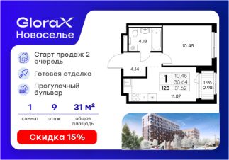Продается 1-комн. квартира на 9-м этаже в строящемся проекте комфорт-класса GloraX Новоселье. Общая площадь лота составляет 31,62 кв. м, из которых 10,45 кв. м отведено под жилую и 11,87 кв. м под кухонную зону. Номер квартиры - 123