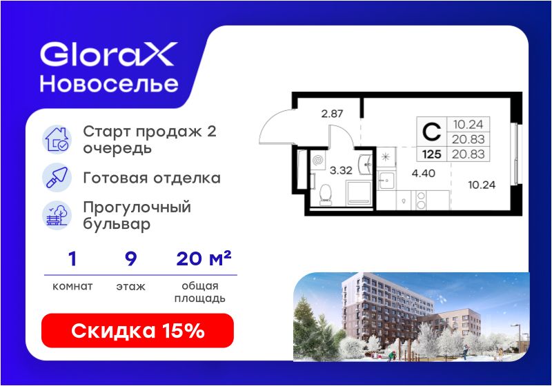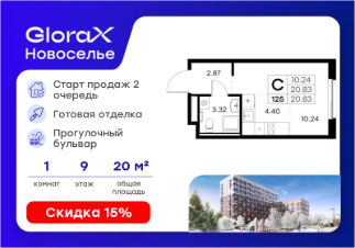 Продается квартира-студия на 9-м этаже в строящемся проекте комфорт-класса GloraX Новоселье. Общая площадь лота составляет 20,83 кв. м, из которых 10,24 кв. м отведено под жилую и 4,40 кв. м под кухонную зону. Номер квартиры - 125